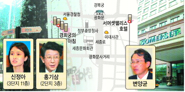 이 오피스텔은 신씨가 미국으로 도피하기 직전까지 살았던 곳으로 홍 전 총장은 신씨의 오피스텔과 작은 골목 하나를 사이에 둔 ‘이웃 사촌’인 셈이다. 신씨는 홍 전 총장과 같은 시기인 올 1월 보증금 2000만원에 월세 200만원을 내고 115㎡ 규모의 오피스텔에 이사왔다. 이미 알려진 것처럼 변 전 실장도 이 오피스텔에서 800m쯤 떨어진 호텔에 장기 투숙해 이번 사건과 관련해 홍 전 총장 및 신씨와의 연결 고리에 대한 의구심을 낳고 있다.
