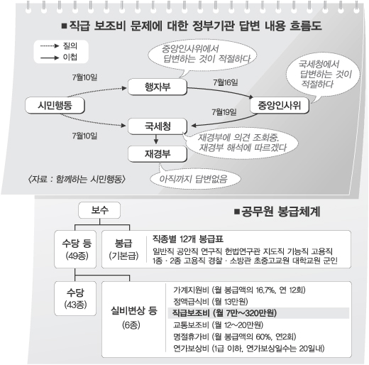 시민행동은 지난 7월10일 행자부와 국세청에 질의서를 발송했다. 국세청은 7월25일 ‘재경부에 의견조회 중이며 직급보조비에 대한 과세는 재경부 해석에 따르겠다.’고 답했다. 행자부는 7월16일 ‘중앙인사위에서 답변하는 게 적절하다.’면서 중앙인사위로 이첩했다. 중앙인사위는 7월19일 ‘국세청에서 답변하는 게 적절하다.’면서 국세청으로 이첩했다. 이에 대해 국세청은 다시 ‘이전 국세청과 중앙인사위 답신 참조 요망’이라고 회신했다.