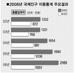 통계청이 18일 발표한 ‘2006년 국제인구이동통계’에 따르면 지난해 한국인과 외국인을 통틀어 국내로 들어온 사람은 63만 8980명, 해외로 나간 사람은 59만 5253명으로 4만 4000명의 ‘입국초과’를 기록했다. 국내 입국 인구가 출국 인구보다 많은 것은 지난 2000년 1만 2589명 입국초과 이후 처음이다. 그동안 우리나라는 줄곧 출국인이 더 많은 ‘출국초과’ 현상을 보였다.