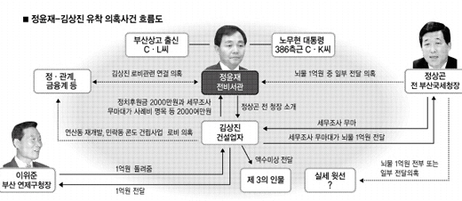 정 전 비서관과 김씨를 둘러싼 의혹의 축은 연산동 재개발과 민락동 콘도건립사업. 이 양대 축에 얽힌 김씨의 커넥션에 정 전 비서관을 고리로 친노 인사들이 직·간접적으로 연결돼 있다는 소문이 정설처럼 나돌고 있다. 김씨가 평소 친노 인사들과의 친분을 자랑하고 다녔다는 점에서 설득력을 얻고 있다.