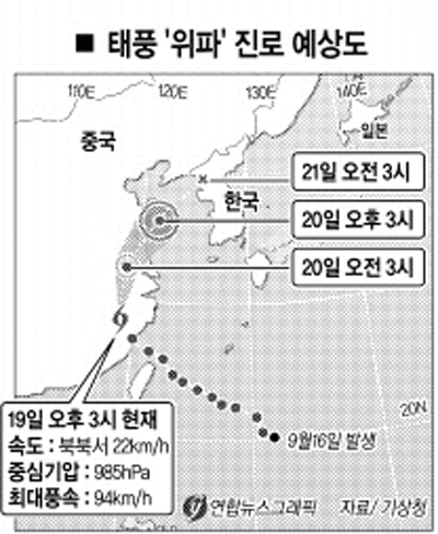 기상청은 19일 “위파는 최대풍속이 초속 33m(119㎞/h)로 강한 중형급 태풍”이라면서 “하지만 중국 대륙을 거쳐 이동하면서 20일 세력이 약화될 것”이라고 밝혔다.