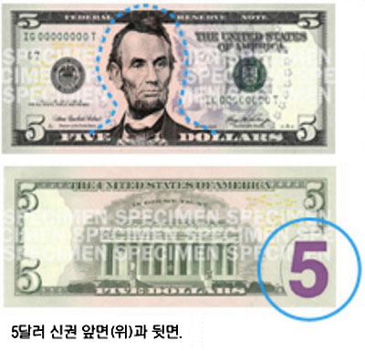 지난해 미국에서는 위조 지폐와 관련, 체포 건수가 3945건에 달했다.5달러 신권은 다음주부터 인쇄에 들어가지만 내년 봄부터 통용될 계획이다.5달러 신권은 웹사이트 http:///www.moneyfactory.gov//newmoney/ain.cfm/currency//new5 에서 볼 수 있다.