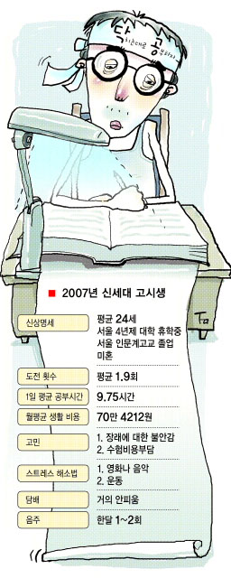 하지만 가장 힘든 점으로 ‘장래에 대한 불안’(36%)을 꼽아 수험생들이 합격에 대해 강한 스트레스에 시달리고 있음을 보여줬다. 신림동의 한 고시학원에서 강사로 활동하고 있는 조현씨는 “요즘 고시생들은 고액과외로 명문대에 들어간 학생이 대부분이고, 고학으로 공부하는 학생은 찾아 보기 어려울 정도”라며 신세대 고시생의 풍속도를 전했다.