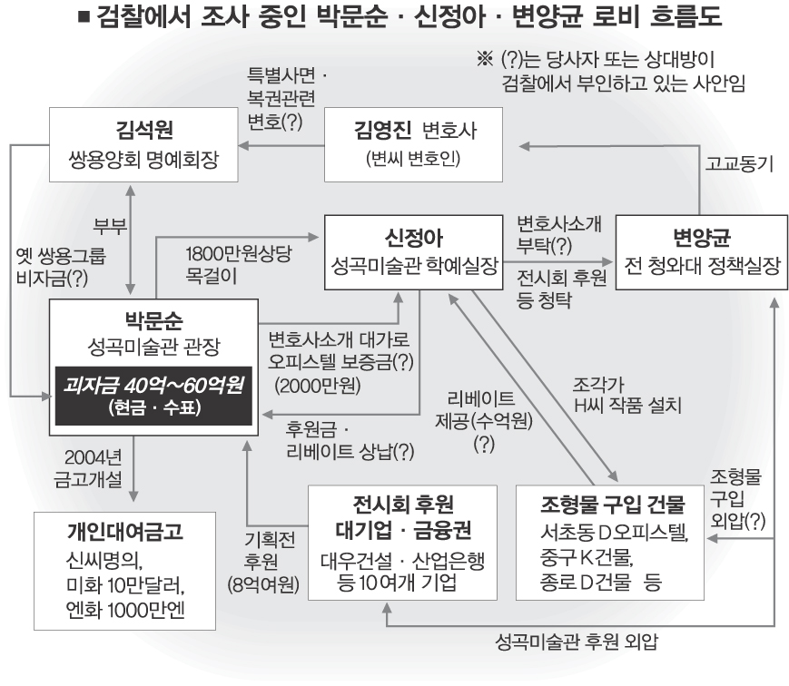 변양균 전 청와대 정책실장의 신정아씨 비호 의혹을 수사 중인 검찰은 성곡미술관 박문순 관장의 집에서 발견된 수십억원의 괴자금 출처와 이 돈이 신씨가 받은 대기업의 미술관 후원금이나 조형물 리베이트 등과 연루돼 있는지를 밝히는 데 수사력을 모으고 있다.