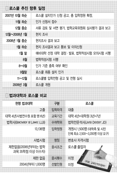 지난해 로스쿨 첫 졸업생을 배출한 일본의 경우 74개교에 정원은 5825명에 이른다. 그러나 로스쿨 과정을 거친 학생들의 신(新)사법시험 합격률은 지난해 48.3%, 올해 40.2%로 절반에도 미치지 못한다. 기존의 사법 시험 정원보다 훨씬 많은 정원을 로스쿨에 배치하면서 생긴 부작용으로, 결국 로스쿨의 입학생이 줄면서 존폐 문제까지 거론되고 있다. 이를 해결하려면 신 사법시험의 합격률을 올리거나 총 정원을 줄여야 하는데, 이는 질 관리와 로스쿨의 반발 등을 감안하면 사실상 불가능하기 때문에 일본의 전철을 밟지 않기 위해서라도 신중히 시작해야 한다는 게 교육부의 논리다.
