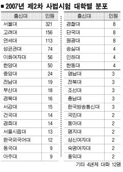 2007년도 사법시험 2차 합격자 가운데 10명 이상을 배출한 국내 4년제 대학은 서울대 등 15곳으로 집계됐다. 단 한 명이라도 합격자를 낸 대학은 모두 46곳이다.