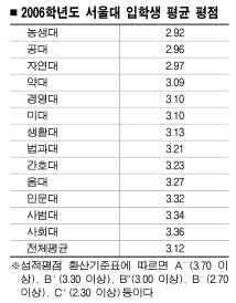 22일 서울대가 국회 교육위원회 유기홍(대통합민주신당) 의원에게 제출한 ‘서울대 신입생 전형별 학부평점’을 분석한 결과,2006학년도 신입생들의 1학년 평균 평점은 4.3만점에 3.12이며, 전체 단과대 가운데 주요 이공계로 꼽히는 자연대(2.97), 공대(2.96), 농대(2.92)만 3.0에 미치지 못했다. 의대와 치대, 수의대 1학년생(예과)은 자연대에 포함됐다. 성적평점 환산기준표에 따르면 2.70∼2.99까지는 ‘B-’,3.00∼3.29까지는 ‘B0’이다. 서울대가 단과대별 학생들의 성적을 조사·분석한 것은 처음이다.