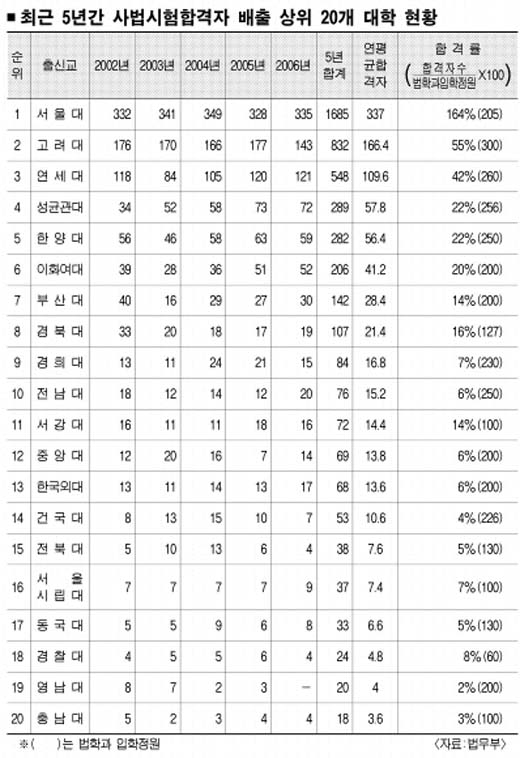 법학과 졸업생 대비 사시 합격자 비율은 서울대가 164%로 가장 높았고, 고려대 55%, 연세대 42%, 성균관대·한양대 22%, 이화여대 20% 등의 순이었다.