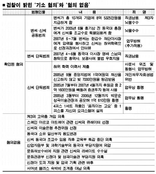검찰은 지난 11일 변씨에 대해 성곡미술관 기업 후원금과 관련해 제3자뇌물수수 및 권리행사방해, 동국대 교수 임용 관련 뇌물수수 혐의, 흥덕사와 보광사 특별교부세 편법 지원 혐의를 적용했다. 신씨에 대해서는 사문서 위조 및 행사, 업무방해, 횡령, 사기회생, 특가법상 알선수재 등 10여개의 혐의를 적용했다.