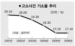 또 고소·고발 건수가 해마다 늘어나고 있는데 반해 기소율은 뚝 떨어지고 있다. 법무부에 따르면 피고소자 수는 지난해 59만 739명으로 2001년 50만 7107명에 비해 16% 가량 증가했지만, 실제 기소된 사람은 지난해 10만 931명으로 2001년 10만 2046명에 비해 오히려 줄었다. 기소율은 2001년 20.1%에서 지난해 17.1%로 크게 떨어졌다. 특히 사기·횡령·배임 등 돈과 연관된 사건의 경우 기소율이 12.2%에 불과했다. 형사사건 평균 기소율(40∼50%)에 크게 못 미치는 수치로 형사고소 5건 중 4건 이상은 고소할 필요가 없었던 사건인 셈이다.