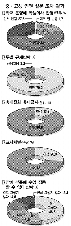 중·고등학생 10명 중 8명이 두발 및 복장 규제와 소지품 검사, 교사 체벌 등에 대해 강한 불만을 가지고 있는 것으로 조사됐다. 또 학생 7명은 잠이 부족해 수업에 집중할 수 없다고 답해 입시 공부로 인한 고충이 큰 것으로 나타났다.