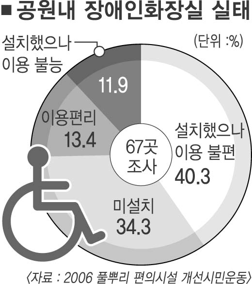 최근 장애인의 권익에 대한 인식이 높아지면서 예전보다 장애인용 화장실을 찾는 것은 쉬워졌다. 그러나 설치율만 높아졌을 뿐 실제 이용률은 극히 낮다. 정작 장애인들이 이용하기 어렵게 설계된 화장실이 많기 때문이다. 풀뿌리 편의시설개선 시민운동이 2006년 공원, 은행, 공연장, 병원 등 10개 시설을 대상으로 조사한 화장실 실태는 이를 적나라하게 보여준다.