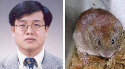 고려대 의대 미생물학교실 송진원(사진 왼쪽) 교수는 11일 전북 무주군에서 채집된 쥐(오른쪽)의 폐 조직에서 기존에 보고되지 않은 신종 한타바이러스를 발견,‘무주바이러스’로 명명했다고 밝혔다.