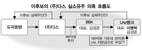 한나라당 이명박 대선 후보 연루 의혹이 제기된 BBK 주가조작 사건에 대한 검찰의 행보가 빨라지고 있는 가운데 이 후보가 차명 소유하고 있다는 의혹을 받고 있는 ㈜다스가 이 후보가 직접 만든 인터넷금융회사인 LKe뱅크의 자본금으로 유입됐다는 의혹이 제기돼 논란이 일고 있다.㈜다스의 자금이 LKe뱅크의 자본금으로 흘러들어간 것이 사실이라면 이는 이 후보가 ㈜다스를 실질적으로 소유하고 있다는 점을 반증하는 것으로, 적잖은 파문이 예상된다.