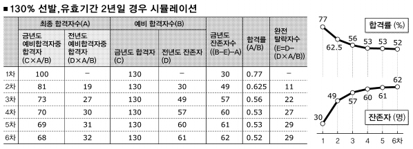 예비합격자를 줄이는 대신 응시기회를 확대해 수험생의 부담을 줄인 모형 2의 보완형이다. 이 경우 초기연도에는 최종합격률이 77%지만 4∼5년차 이후부터는 약 52%로 떨어진다. 인원수로 환산하면 잔존하는 예비합격자가 매년 62명 정도 된다는 얘기다.