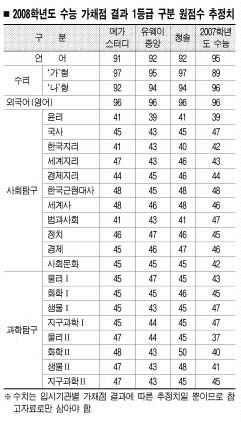 등급제를 처음 적용하는 2008학년도 대학수학능력시험을 가채점한 결과 일부 영역의 1등급 커트라인이 높아지자 최상위권 수험생들을 중심으로 대학별 고사에 ‘올인’하는 분위기가 형성되고 있다.1∼2개만 틀려도 등급이 바뀔 경우 수능 점수만으로는 안심할 수 없어졌기 때문이다. 특히 일부 상위권 대학들이 학생부 성적의 등급 간 점수차를 좁혀 내신 영향력을 축소하려는 움직임을 보여 대학별 고사의 중요성은 더욱 부각되고 있다.