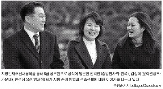 지역인재를 등용하기 위한 지역인재추천채용 일정이 내년 1월 대학별 추천전형으로 시작된다.2005년과 2006년 지역인재추천채용제도를 통해 공직에 입문한 선배들에게 준비방법과 6급 견습생활에 대해 들어봤다.●인터뷰 참석자 ▲진익한(1회·경상대·경남):중앙인사위원회 임용관리과 ▲김성희(2회·금강대·충남):문화관광부 국제교류진흥팀·24세 ▲한경심(2회·한양대·서울·기술):소방방재청 안전문화팀·25세