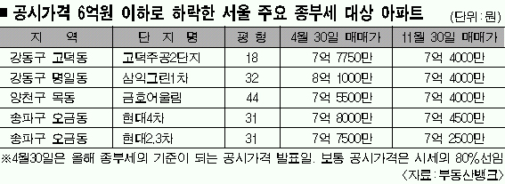 서울은 전반적인 집값 침체에도 불구하고 매매가 7억 5000만원 초과 아파트가 증가했다. 예컨대 서울에서 종부세 대상 아파트는 지난 4월30일 현재 19만 8037가구에서 11월 28일 현재 20만 1903가구로 2.0%(3866가구) 늘어났다.
