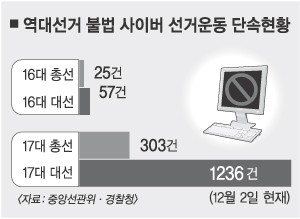 대선을 앞두고 인터넷에서 전쟁이 시작됐다. 선거법의 ‘칼날’을 휘두르는 선거관리위원회와 경찰에 누리꾼과 인터넷매체들이 불복종운동으로 맞서는 양상이다.2일 중앙선관위에 따르면 대통령선거와 관련, 선관위의 요구로 인터넷 상에서 삭제된 글이나 사용자제작콘텐츠(UCC)는 무려 6만 5108건에 이른다. 경찰청에 따르면 불법 선거운동 혐의로 입건된 이른바 ‘사이버 사범’은 모두 1312명(1236건)이다.