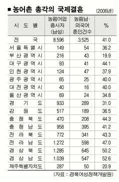 2일 경북여성정책개발원 정일선 수석연구원에 따르면 지난 한해 동안 혼인신고를 한 전국 남성 농림·어업 종사자 8596명 가운데 3525명(41%)이 국제결혼을 한 것으로 조사됐다.