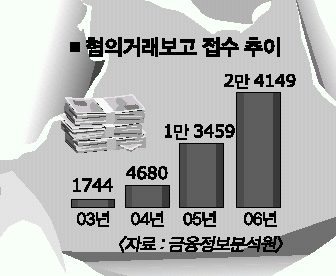 국책은행에서 기업금융을 담당하는 이모(38)씨는 “기업들이 2000만원 이상의 현금을 찾을 때는 며칠에 걸쳐 1900만원씩 나눠 인출하는 것이 관행”이라고 말했다. 특히 은행원들은 1회에 2000만원 이상을 거래하는 기업 고객이 있다 해도 치열한 영업 경쟁 때문에 돈의 사용처를 묻지 않고 임의로 ‘설비구입자금’이나 ‘매매대금’으로 적어 FIU에 보고하는 것으로 알려졌다.
