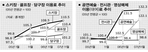 ‘웰빙·레저’문화가 확산되면서 스키·골프장 이용료, 공연·전시장 관람료가 빠르게 인상되고 있다.2005년 이후 평균 물가 상승폭보다 2∼5배에 이른다. 시대 흐름에 따른 소비패턴 변화에다 가치 있는 소비엔 돈을 아끼지 않는 최근 소비성향 등이 맞물린 결과로 풀이된다.