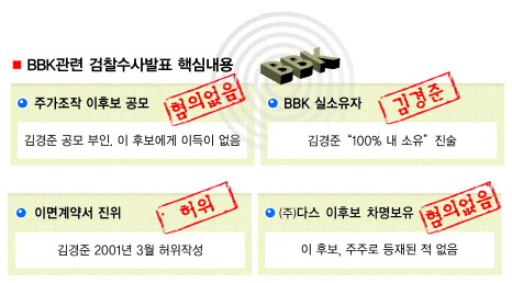 검찰은 이날 이 후보에게 제기됐던 대부분의 의혹에 대해 무혐의라는 결론을 내리고 이 후보를 불기소 처분한다는 수사결과를 발표했다. 김경준씨는 BBK 회사 돈 319억원 횡령, 옵셔널벤처스 주가조작, 사문서 위조 및 위조 사문서 행사 혐의로 구속기소됐다.
