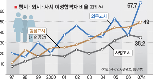 고시에서의 ‘여풍’은 해마다 위세를 더했다. 행정고시 합격자의 여성 비율은 10년새 무려 5배나 급증했다.1997년 11.2%에 지나지 않았던 여성 합격자 비율은 2003년 30%를 돌파했고,2005년 40%대를 처음 넘겼다. 여성이 전통적으로 강세인 외무고시는 올해 여성합격자 67.7%를 기록하기도 했다. 사법시험도 지난해보다 2%p줄기는 했지만 35.2%나 된다.