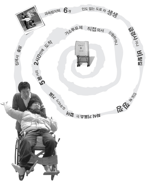 중앙선거관리위원회에 따르면 17대 대선 유권자 가운데 4급 이상 장애인은 81만여명으로 전체 유권자의 2.2%에 이른다.“정치가 아무리 혐오스러워도 투표하지 않고 비판만 하면 옳지 않아요. 저도 장애인 정책을 살펴보고 2명의 후보를 마음 속에 담아두고 있는데 누가 대통령이 되든 장애인들의 주거권과 이동권을 제대로 보장해 줬으면 좋겠어요.” 정씨의 얼굴에 활짝 피어오른 미소가 겨울햇살에도 밝게 빛난다.