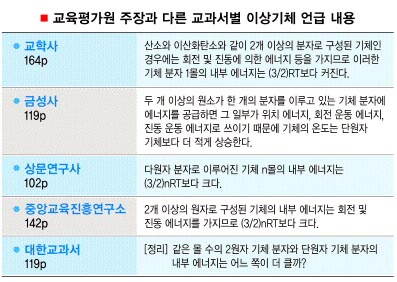 교육평가원이 근거로 제시한 제7차 교육과정에는 ‘단원자 분자 이상 기체의 내부에너지를 계산하는 방법만 다루도록 한다.’는 규정은 없는 것으로 확인됐다. 아울러 교육부의 인검증을 거친 다른 대부분의 교과서에는 ‘다원자 분자’ 문항이 포함돼 있는 것으로 밝혀졌다.