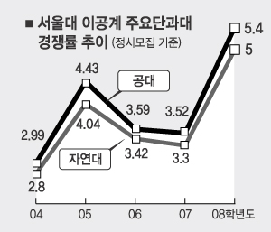 30일 서울신문이 지난 27일 마감한 서울대 2008학년도 정시모집 지원 결과를 분석한 결과 자연대·공대 모든 학과의 경쟁률이 전년도보다 올랐다. 자연대와 공대의 평균 경쟁률 각각 5.0대1과 5.4대1로 2004학년도 이후 최고를 기록했다.