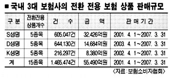 이런 피해는 기존 보험을 해약하고 책임준비금(해약환급금)을 이용해 새 보험에 가입하는 ‘계약전환’에서 많이 발생한다. 보험사는 아예 전환전용 보험상품까지 내놓고 있다. 준비금을 일시에 예치할 수 있고, 보험사에 불리한 내용을 새 상품으로 전환시키면서 삭제할 수 있는 일석이조(一石二鳥) 효과를 노린 것이다. 국내 3대 생명보험사가 2001년 4월부터 2007년 3월까지 판매한 전환전용 보험은 146만 5474건,5조 5490억원어치에 이른다.