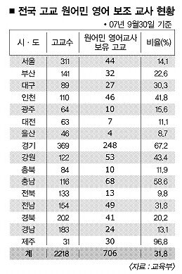 당장 현직교사의 영어수업을 도와줄 원어민 영어보조교사가 턱없이 부족하다. 본지가 29일 교육인적자원부에 확인한 전국의 고등학교 원어민 교사 확보 현황 자료(2007년 9월)에 따르면 10곳 중 3곳 정도만 원어민교사를 두고 있다. 그나마 고등학교의 원어민 교사 보유율은 지역간 격차가 심해 영어교육의 양극화 현상도 우려된다.