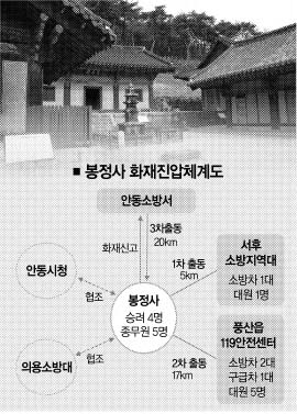 화재 발생시 소방서의 도움은 엄두도 낼 수 없는 구조적인 취약점을 갖고 있었다.17㎞ 떨어진 곳에 풍산소방서가 있지만 현장 출동까지 최소 10∼15분 이상 걸린다. 기관간 협조와 책임 소재도 불명확했다. 국보급 목조 문화재가 많은 봉정사의 방재체계 부재는 우리의 ‘방재 지킴이’ 현실이었다.