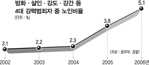 법무부 등 자료에 따르면 60세 이상 노인 범죄는 1996년 전체의 1.5%(4만여명)에서 2005년 3.8%(8만여명),2006년 5.1%(10만여명)로 증가했다. 지난해 기준으로 노인범죄 가운데 폭력범과 지능범(사기·고소)이 각각 2만명으로 엇비슷했다.60세 이상 노인 살인범도 96년 18명에서 2005년에는 96명으로 5.3배 많아졌다. 노인 성폭력범도 96년 91명에서 2005년 430명으로 4.7배, 노인 방화범은 같은 기간 8명에서 63명으로 7.4배 늘었다. 한편 60세 이상 노인인구는 1997년 전체의 9.7%에서 2007년 13.8%(680만명)로 증가했다.