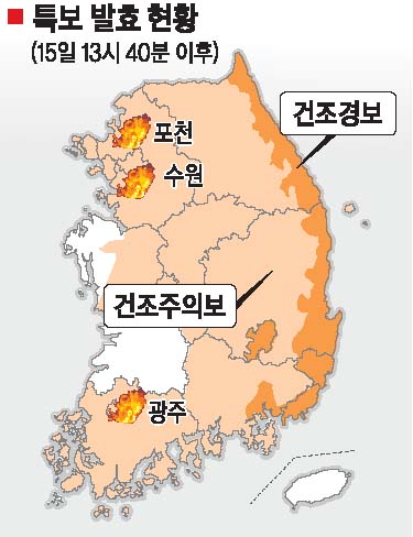 전국에 ‘건조 비상령’이 내려졌다. 건조 경보·주의보가 발효된 지역이 예년보다 넓어졌다. 강원·경북의 동부해안 지역이 특히 심하다. 기상청은 대기건조 상태가 당분간 계속될 것으로 예상했다. 겨울 강수량이 적은 데다 바람도 심해 15일 오후 광주와 경기 포천에서 산불이 잇따라 발생했다.