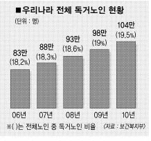 혼자 사는 65세 이상 노인 10명 중 9명이 만성질환을 앓고,10명 중 3명은 일주일에 한 끼 이상 굶는다는 조사 결과가 나왔다. 또 10명 중 6명은 당장 의학적 치료를 필요로 했고, 첫손가락에 꼽는 수입원은 월 1만원 안팎의 ‘교통수당’이었다.