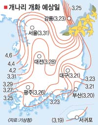 개나리·진달래 등 봄꽃이 지난해보다 8∼9일 늦게 필 전망이다. 서울에서는 개나리가 3월31일, 진달래가 4월3일쯤 피기 시작할 것으로 보인다.