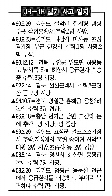 부대로 돌아가면 두 다리 쭉 뻗고 누워 긴급 출동의 피로를 풀어야겠다고 생각하던 순간이었다. 새벽 1시10분쯤. 헬기가 갑자기 흔들렸다. 짙은 안개 속 45도 각도로 추락하는 순간, 그들의 몸은 얼어붙었다.