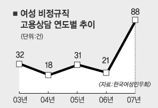 여성 비정규직의 삶은 아직 고단하다. 특히 지난 7월 비정규직법 시행은 ‘이랜드 비정규직 사태’에서 알 수 있듯 상황을 악화시켰다. 한국여성민우회의 ‘여성 고용상담 경향 분석 및 주요상담사례’에 따르면 지난해 전체 고용상담 323건 가운데 비정규직 상담은 88건이었다. 직장내 해고, 성희롱 등이 주된 상담 사유였다. 이는 2006년 21건,2005년 31건에 비해 세 배 이상 증가한 것이다.