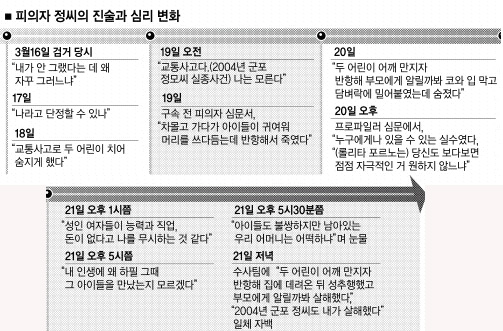 오후 5시쯤. 정씨를 다독이면서 “당신이 죄를 뉘우친다고 이해받기 위해선 했던 일을 객관적 사실로 털어놓는 게 도움이 된다.”고 슬쩍 떠봤다. 정씨는 고개를 숙이고 한참 몸을 떨며 고민했다. 그러다 “하필이면 내 인생에서 왜 그때 그 순간 아이들을 거기에서 만났나.”며 강한 자기부정을 내비쳤다. 이어 “아이들도 불쌍하지만 남아 있는 내 어머니는 어떡하냐.”며 울음보를 터뜨렸다.