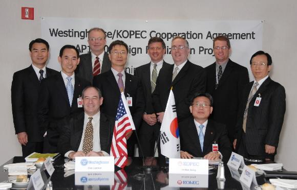 송인회(오른쪽 앉은 이) 사장이 직접 미국으로 날아가 31일(현지시간) 피츠버그 WEC 본사에서 바니엘 S 리프먼 WEC 부사장과 함께 계약서에 서명했다. 이번 계약은 선진 원전회사들에서 설계업무를 넘겨받아 부분적으로 진행하는 프로젝트이기는 하지만 미국에서 원전기술을 배워온 KOPEC이 미국에 기술을 역수출했다는 점에서 의미가 있다. 계약금도 300억원에 이른다.