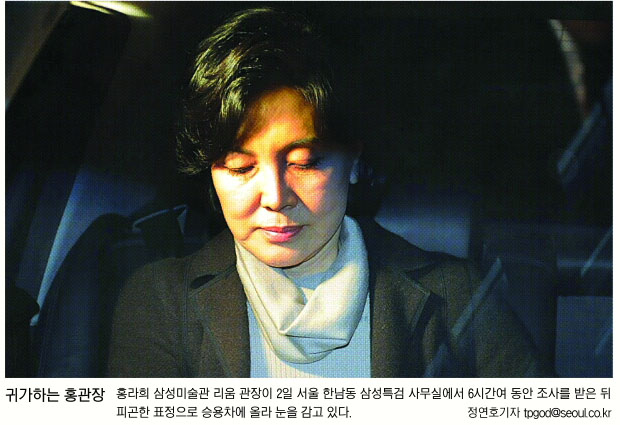 이날 오후 3시쯤 출석한 홍 관장은 오후 9시30분쯤 조사를 마치고 귀가했다. 홍 관장은 조사 내용을 묻는 취재진에게 “오랫동안 조사받은 것을 어떻게 한마디로 말하겠느냐.”라고 말했다. 또 제기된 의혹이 모두 사실이 아니냐는 질문에는 “예(사실이 아니다).”라고 짧게 답했다. 로이 리히텐슈타인의 ‘행복한 눈물’ 등 고가 미술품 구입 여부에 대해 홍 관장은 특검에서 “잠시 대여했던 것뿐”이라고 진술한 것으로 알려졌다.