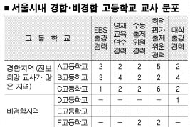 서울신문이 서울지역에서 교사들이 전보를 선호하는 경합지역과 비경합지역의 교사 실태를 조사한 결과 뚜렷한 차이를 보였다. 경합지역에는 EBS출강, 수능 및 학력평가 출제위원, 대학출강 등 이력이 화려한 교사들이 많았지만 비경합지역은 그렇지 못했다(표 참조).