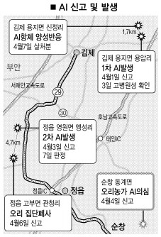 농식품부는 또 정읍 영원면 오리농장에서 5㎞ 떨어진 고부면 관청리 오리농장에서도 AI로 의심되는 집단폐사 현상이 발생해 국립수의과학검역원이 정밀검사를 벌이고 있다고 밝혔다. 오리 1만 8000마리를 사육하고 있는 이 농장에서는 5일부터 최근까지 700마리가 폐사했다.