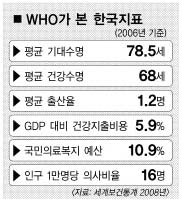 이밖에 WHO가 밝힌 한국 보건상황 지표는 다음과 같다. 국내총생산(GDP)에서 차지하는 건강지출비용은 2000년 4.5%에서 2006년 5.9%로 1.5%포인트 늘었다.1인당 평균 건강 지출비용도 2000년 486달러서 2006년 973달러로 2배 이상 늘었다.