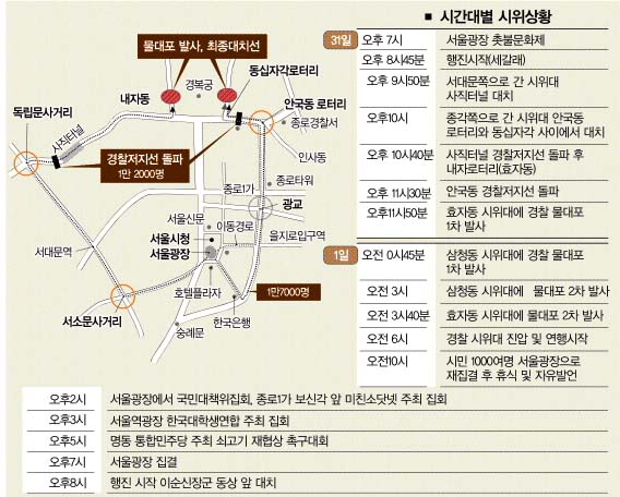 지난 31일에 시작된 대규모 촛불문화제와 거리행진은 2일 새벽까지 2박3일 동안 이어졌다. 물대포를 맞은 채 밤을 꼬박 새운 시위대는 2일 아침부터 서울광장에서 ‘자유발언’을 하며 집회를 계속했다. 오후 2시부터는 명동, 보신각, 서울역 등지에서 열린 집회에 합류했다. 오후 4시쯤 기습적으로 거리행진을 감행, 청와대 근처인 청운동 경복궁역까지 진출했다.