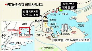 11일 오전 5시쯤 북한의 북강원도 온정리 금강산 특구 내 해수욕장 인근에서 관광객 박왕자(53·여)씨가 가슴과 다리에 북한군의 총격을 받아 숨졌다.
