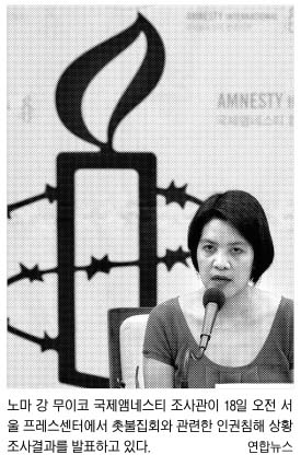 앰네스티 인터내셔널 노마 강 무이코(41·여) 조사관은 18일 서울 중구 태평로 프레스센터에서 기자회견을 갖고 공권력 행사 과정의 인권침해 사례 조사 결과를 발표하며 “한국정부는 평화로운 촛불 시위대에 과도한 무력을 행사한 경찰의 인권침해를 철저히 조사하라.”고 촉구했다.