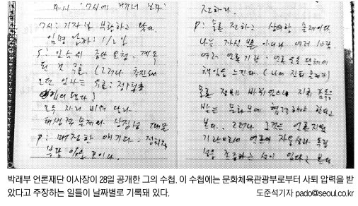 박 이사장의 일지는 그가 신 차관을 만난 직후 신 차관과 나눈 이야기를 대화록 형식으로 복기해둔 것이다. 박 이사장은 “신 차관이 (향후 언론에 공개되면) 자신을 만난 사실을 부인하겠다고 말했고 언론계에서 신 차관과의 개인적 관계도 있어 지금까지 공개하지 않았다.”면서 “이제는 더 이상 침묵할 수도 물러날 곳도 없는 낭떠러지 끝에 서 있는 상황이라 정부의 부당한 압력에 대해 이야기할 것은 다 이야기하려고 한다.”고 밝혔다. 박 이사장과 신 차관은 한국일보 선후배 사이다.